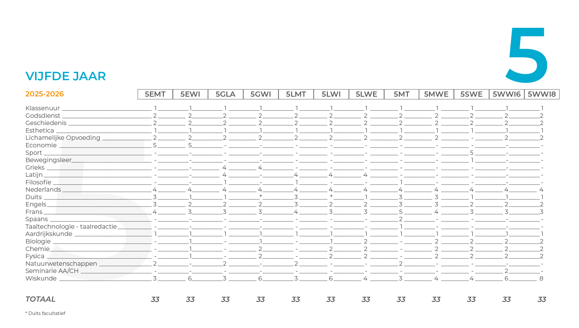 Voor GWI, LWI en WWI8 (6de jaar) is Duits facultatief.